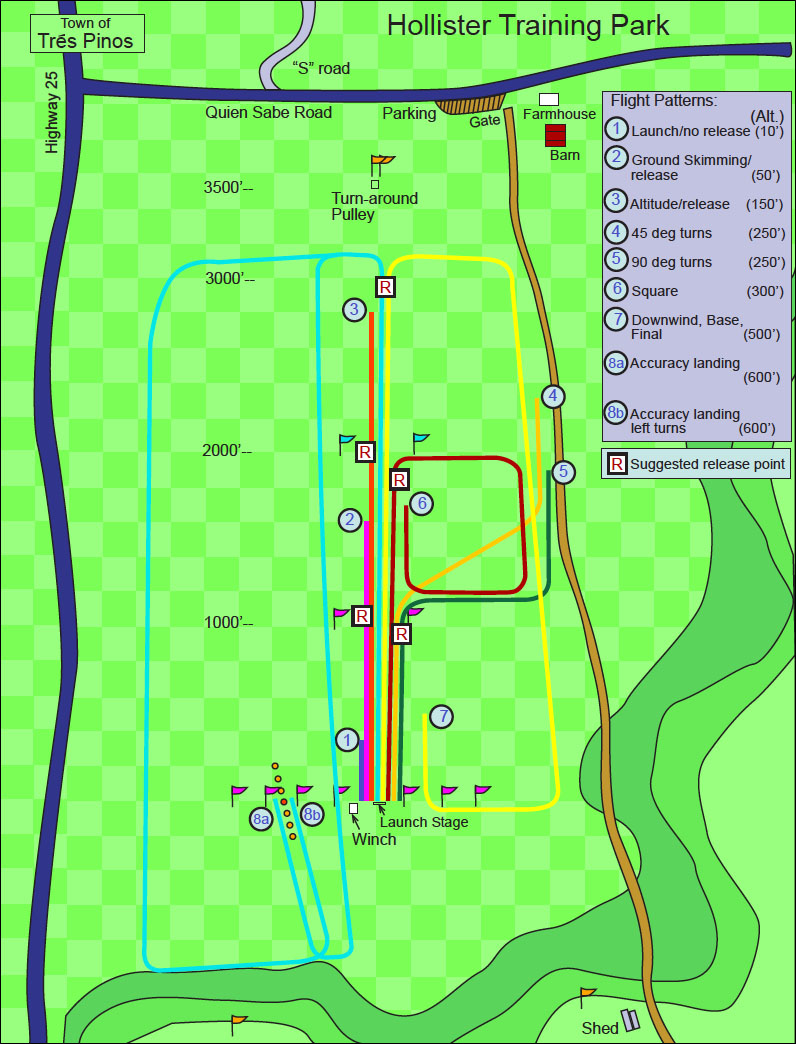 Then what: As pilots progress, they can learn to fly in thermals (rising bubbles of air) and stay aloft for longer and higher flights. In fact, students have learned to work the lift to stay up for over a half hour with a gain of 1000 feet above their release point. A number of advanced pilots have been towed up to then fly ‘cross country’. At Tres Pinos, the distance record is a cross country flight to the south just shy of 30 miles.